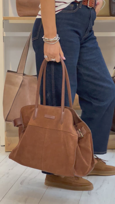 This shopper in soft tan suede is the perfect blend of versatility and elegance. The neutral tone pairs seamlessly with both lighter summer palettes and deeper autumn hues, making it a bag you’ll keep reaching for. From office tailoring to casual denim or flowing dresses, the refined simplicity of the design ensures it always looks chic.